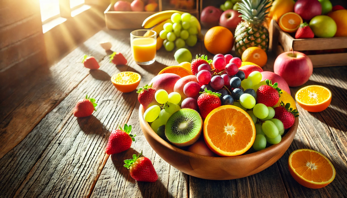 A vibrant bowl of oranges, strawberries, grapes, and bananas, on a wooden table with sunlight streaming in from a nearby window.