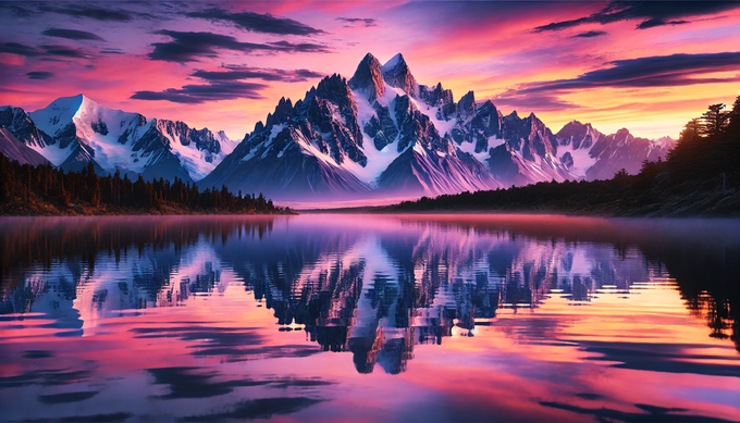 A lake reflecting snow-capped mountains at sunset with the sky glowing in shades of pink, orange, and purple.