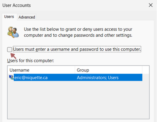 In the User Accounts panel, uncheck the box labeled Users must enter a user name and password to use this computer. If the option isn't there, check the Troubleshooting section for possible solutions.