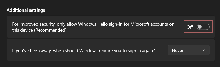 Uncheck (turn off) the option labeled For improved security, only allow Windows Hello sign-in for Microsoft accounts on this device.