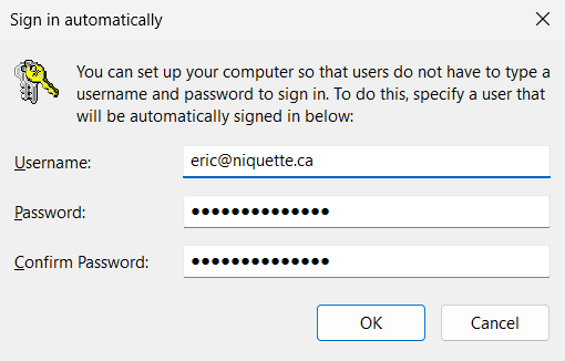 Now that Windows has been configured to allow plain, password-based sign-ins, we can provide a set of credentials to automatically use on startup.